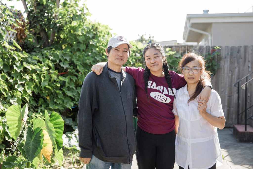 Josie Chen, 18, poses for a photo with her parents YuSheng Chen, left, and ChunLing Chen, right, in the backyard of their home in Oakland, Calif., Sept. 25, 2020. Chen is a freshman at Harvard University where she’s doing distanced learning for her first semester, and as a child, her father would jokingly say, “Go Harvard” because he knew it was a top school. Chen put aside her own dreams to go to a school near the beach in San Diego once she was admitted to Harvard with an offer of full financial aid. Alison Yin for the Hechinger Report