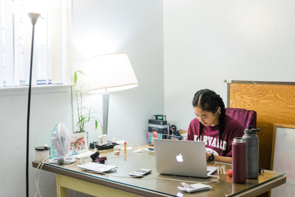 What wasn’t typical was that, instead of hanging out in a common area of a dorm, she was perched at a table in her childhood bedroom, trying not to disturb her parents and two siblings who were asleep on the other side of the cardboard-thin walls.